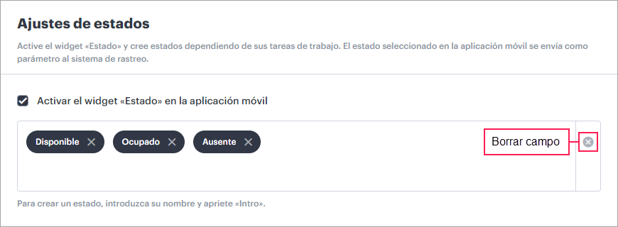 Habilite la opción Activar el widget «Estado» en la aplicación móvil para que en WiaTag se muestre el widget Estado. En el campo más abajo, agregue los estados que puede escoger el usuario de WiaTag. Los estados Available (disponible), Busy (ocupado), Away (ausente) ya están agregados por defecto. Para crear un estado nuevo, escriba su nombre y apriete Intro. Para eliminar un estado, haga clic en el icono