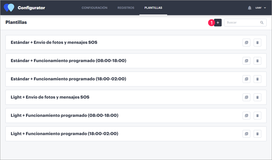 En esta página se puede crear plantillas de configuración. Después estas plantillas pueden aplicarse a los dispositivos de unidades en la página Configuración. Esto facilita el proceso de configuración de dispositivos, ya que no hay que crear de nuevo la misma configuración.