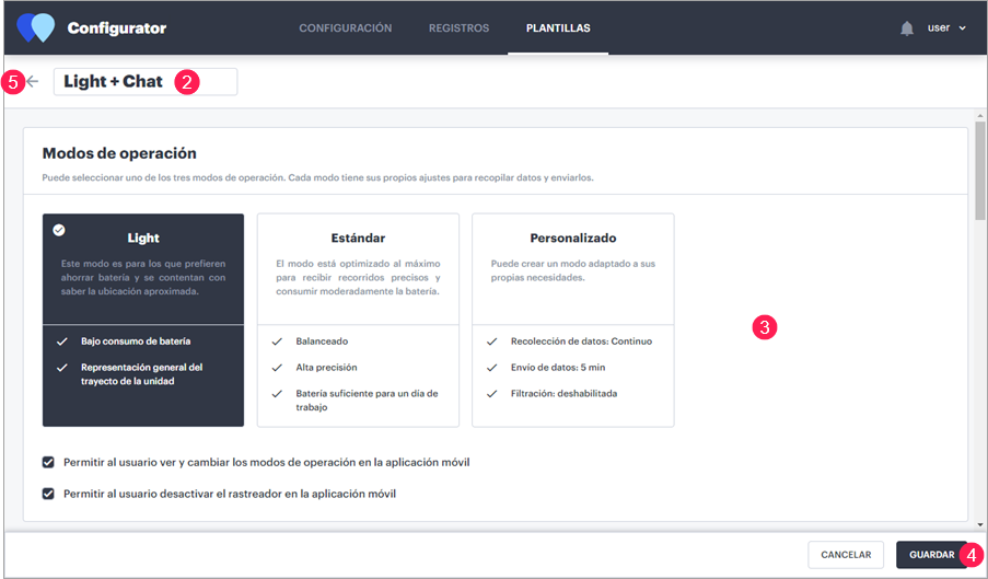 Para modificar la plantilla, haga clic en la línea de la misma, haga los cambios y apriete Guardar. Para no aplicar cambios, apriete Cancelar. Para volver a la lista de plantillas, haga clic en el icono