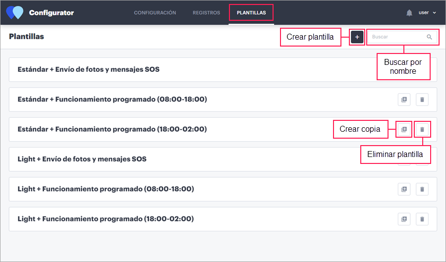 Las plantillas creadas se muestran en la lista en orden alfabético. Se puede realizar las siguientes acciones con las plantillas: modificar, hacer una copia y eliminar.