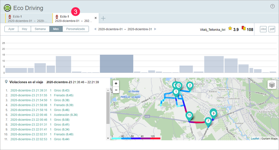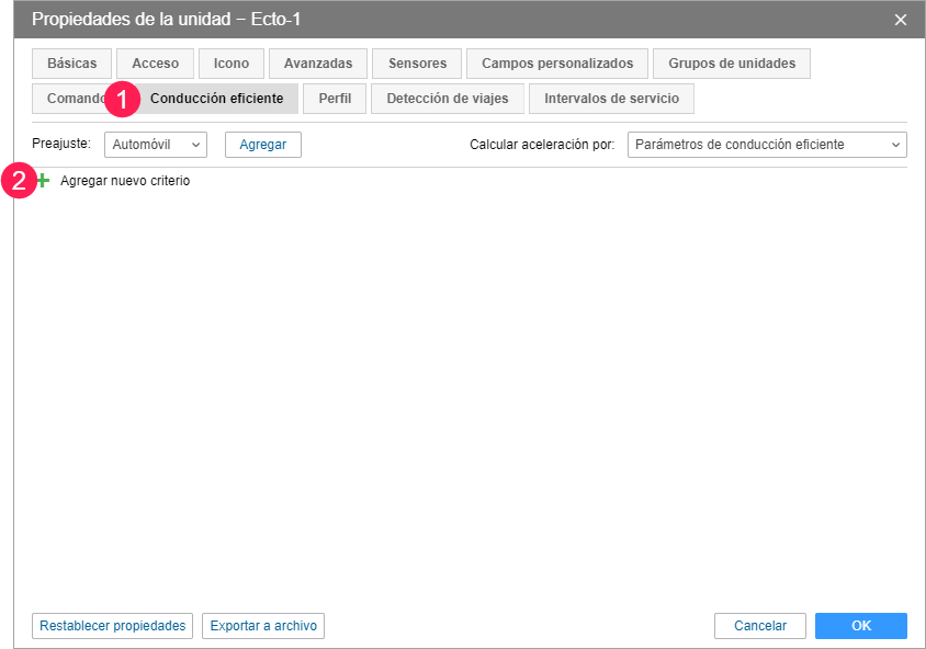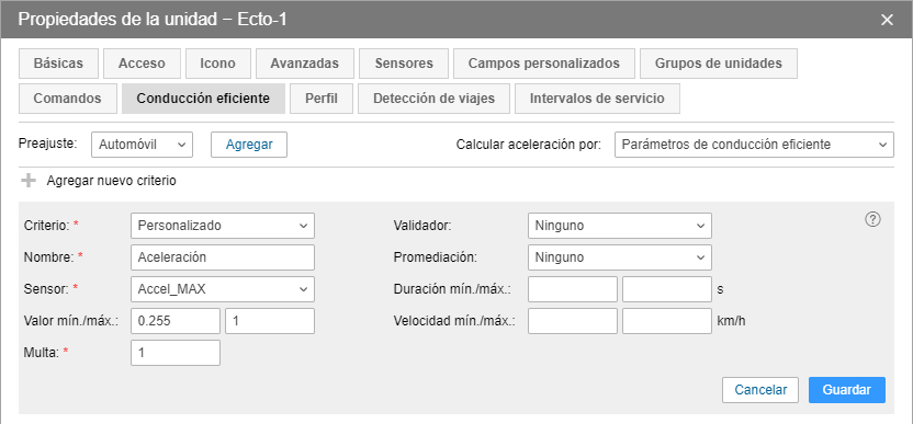 7. Vaya a la pestaña Conducción eficiente y agregue criterios personalizados para los sensores creados.