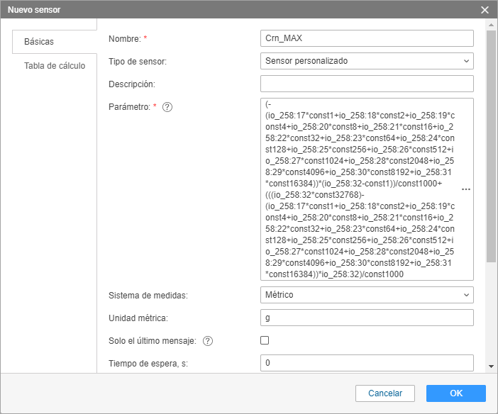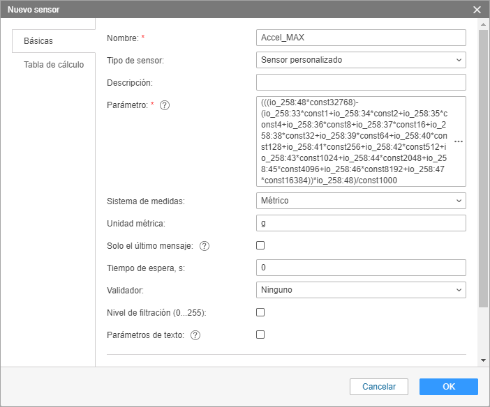 4. Cree un sensor personalizado Accel_MAX. En el campo Parámetro, indique la siguiente fórmula: