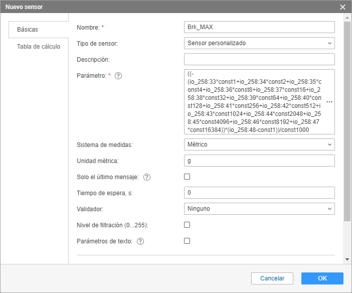 5. Cree un sensor Brk_MAX. En el campo Parámetro, indique la siguiente fórmula: