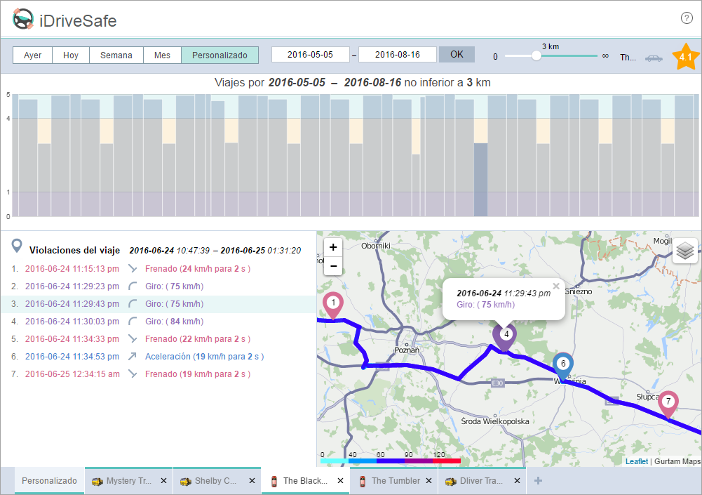 La lista de infracciones detectadas en este viaje se muestra la izquierda del mapa. Si hace clic en un marcador de violación en el mapa, la línea con esa violación se destaca en la lista.