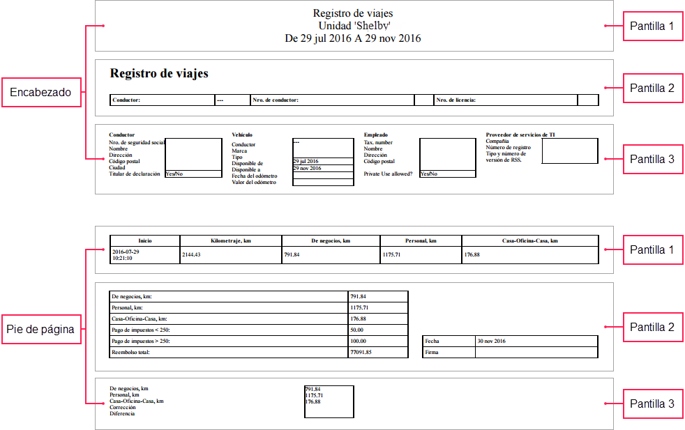 Además, en los campos correspondientes de esta sección se puede introducir valores para los parámetros Kilometraje imponible y el Pago de impuestos. Al imprimir el informe, la suma de reembolso se calcula a partir de los valores introducidos. Para mostrar la suma del reembolso por el kilometraje imponible, hace falta escoger Plantilla 2 en el campo Pie de página y activar la opción Mostrar pago.
