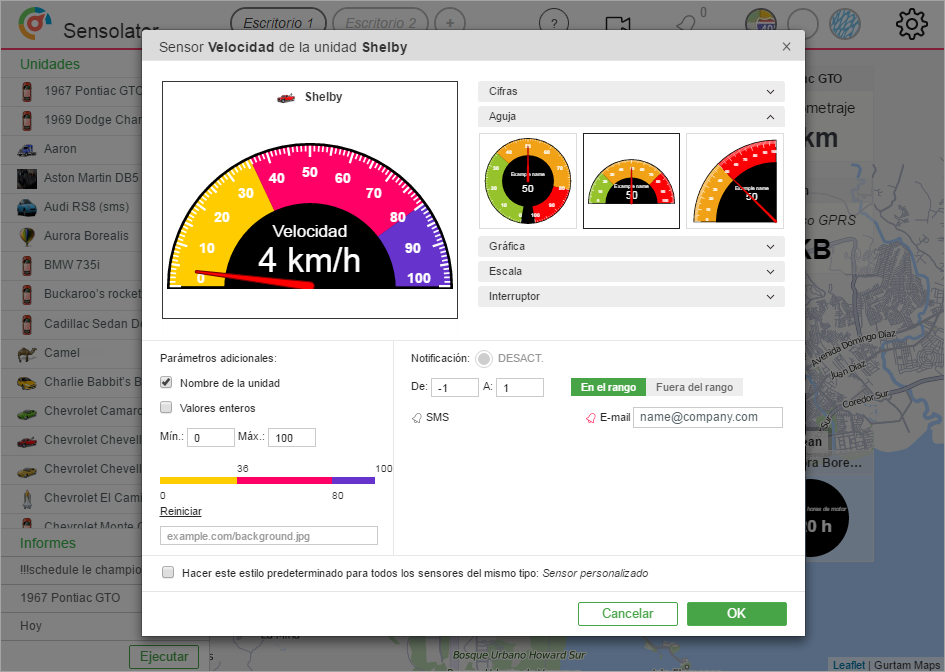 En la plantilla Aguja se puede indicar los intervalos de valores en que está dividida la escala y ajustar los colores para cada intervalo.