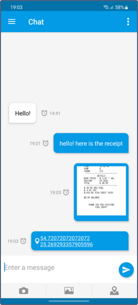 Puede adjuntar fotos nuevas, imágenes guardadas en su dispositivo móviles y ubicaciones a sus mensajes. Para ello, pulse los botones correspondientes debajo del campo de entrada.