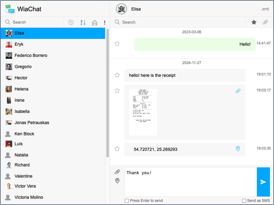 Para guardar el chat completo en formato XML, haga clic en el ícono .xml encima del filtro de mensajes.