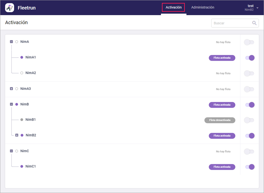 Para activar una flota, el usuario no solo tiene que tener derecho de acceso a la cuenta para que se activa, sino también a su creador. En caso contrario, la activación de flota no está disponible (el interruptor no está activo).