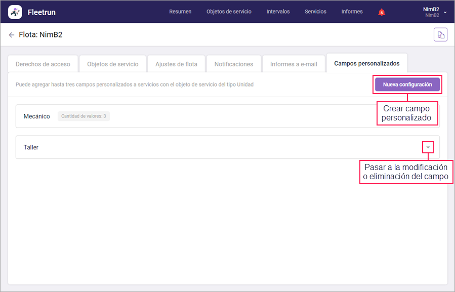 En esta pestaña se puede crear, modificar y eliminar campos personalizados que deben mostrarse en las propiedades de servicios que corresponden a los objetos de servicio de tipo Unidad. Se puede agregar hasta tres campos personalizados.