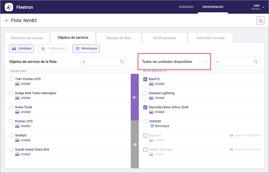 En la pestaña Objetos de servicio hay dos listas: en la de izquierda se muestran los objetos de servicio de la flota; en la de derecha, las unidades, remolques y conductores que pueden ser agregados a la misma. Para ver qué objetos de servicio están disponibles para ser agregados, seleccione el elemento de filtro necesario encima de la lista derecha.