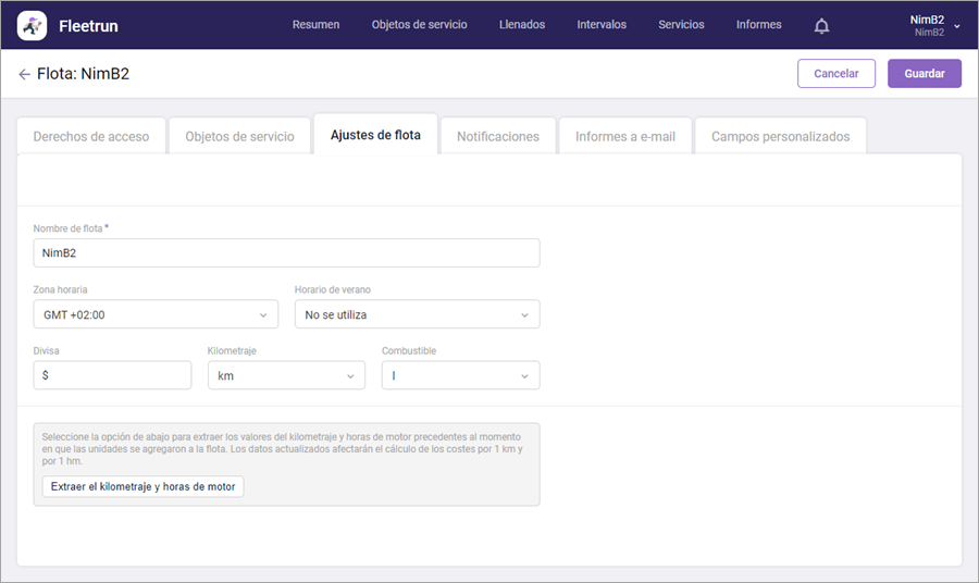 En esta pestaña se indican el nombre de flota, la zona horaria a la que pertenece, el horario de verano, las unidades de medida de kilometraje y de volumen de combustible, la divisa utilizada. Además, aquí se puede extraer de Wialon los valores del kilometraje y horas de motor precedentes al momento en que las unidades se agregaron a la flota.
