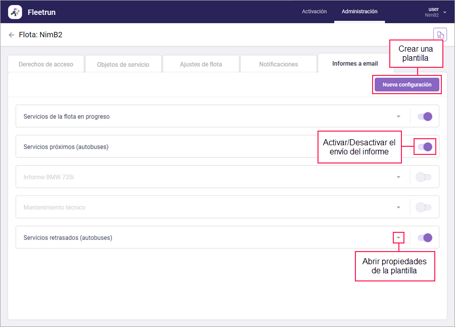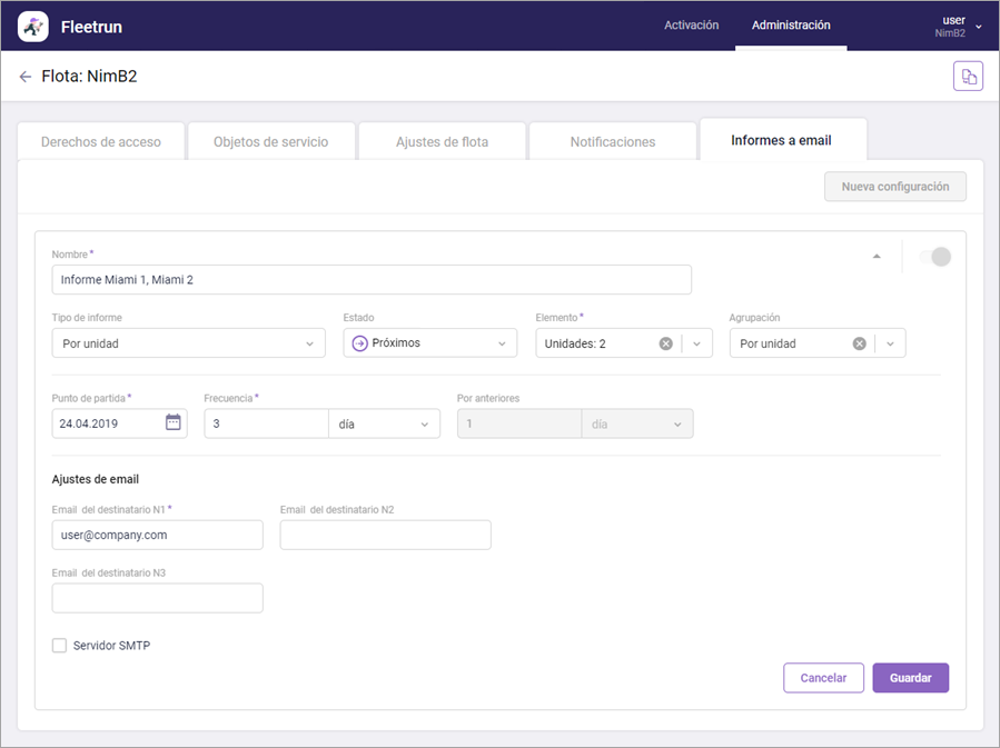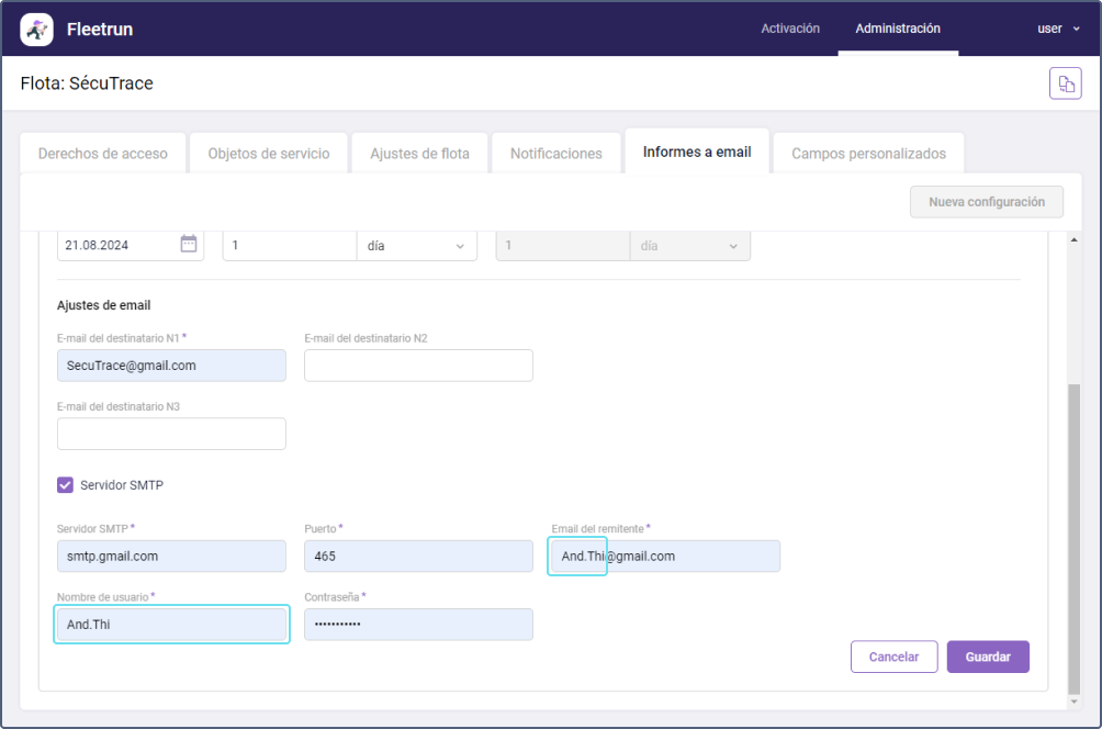 Para enviar informes de Fleetrun desde su servidor SMTP, haga lo siguiente: