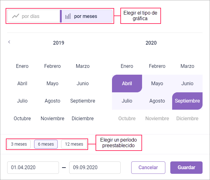 El período por el cual tienen que mostrarse datos en las gráficas se elige en el calendario ubicado en la parte superior de la página. De acuerdo con el interruptor en el calendario, las gráficas pueden construirse por días (gráfica de líneas) y por meses (gráfica de barras). Por defecto se selecciona el tipo de gráfica Por meses.