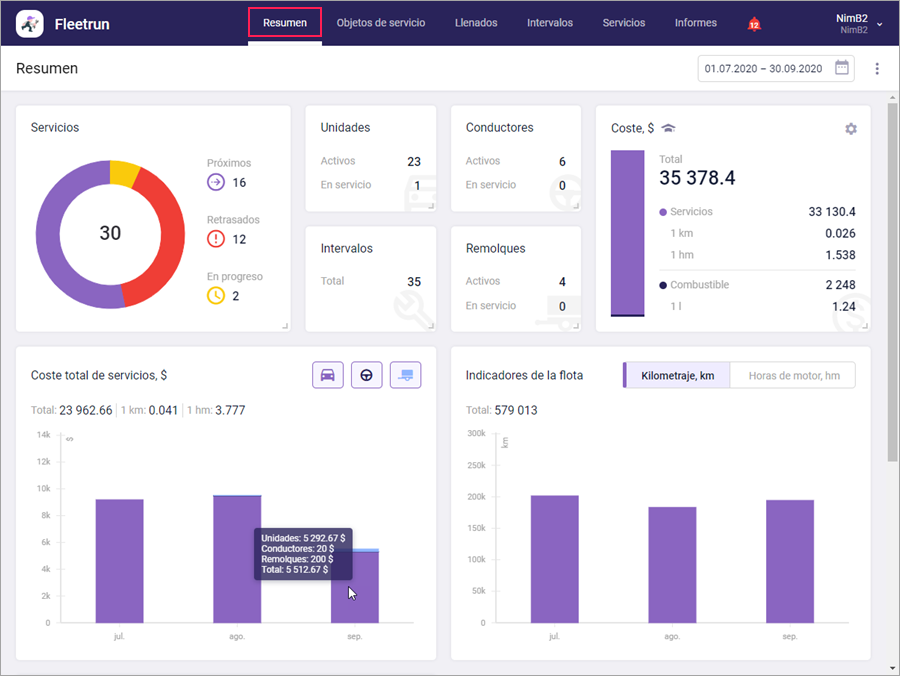 Esta página permite estimar en una pantalla la situación general en la flota, atraer la atención a un servicio de mantenimiento retrasado, ver la relación entre los objetos de servicio activos y los que reciben el servicio, estimar el coste total de gastos en la flota, etc.