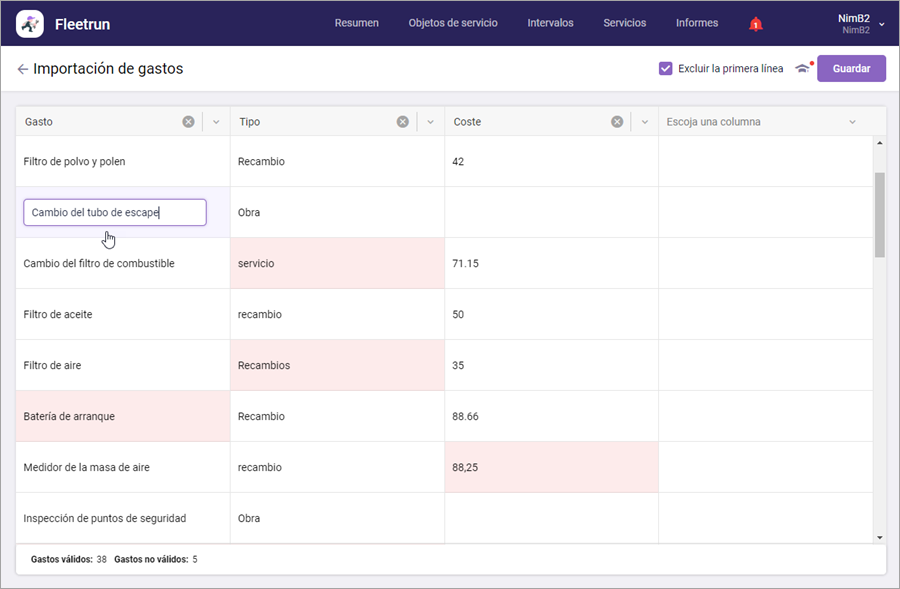 Modifique datos en la tabla si es necesario. Las celdas con datos inválidos se resaltan en rojo. No se puede importar los gastos con tales celdas. Para corregir los datos, haga clic en la celda e introduzca un texto nuevo. Para guardar el texto, haga clic con el botón izquierdo del ratón fuera de la celda.