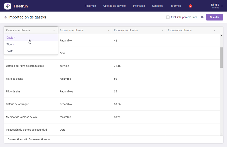 Indique los nombres de columnas en la tabla con los resultados de importación. Para hacerlo, en la lista desplegable encima de la columna seleccione el nombre de la misma. Las columnas obligatorias se marcan en la lista con un asterisco. Para anular la selección, haga clic en el icono