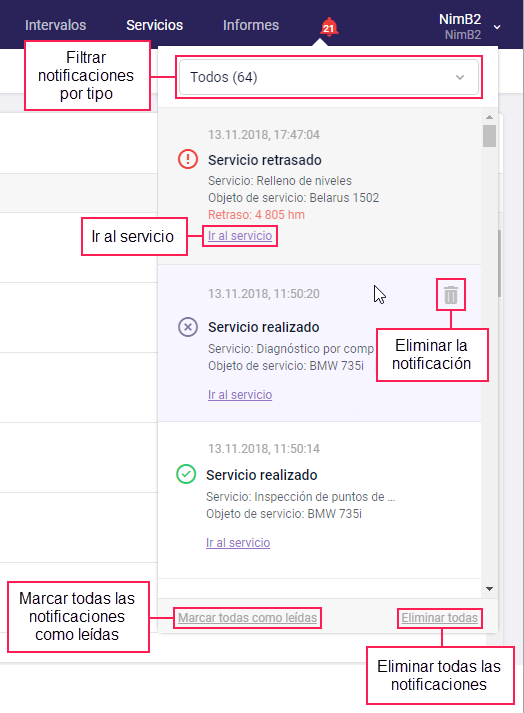 Cada notificación de la lista contiene la siguiente información: fecha y tiempo, tipo de notificación, descripción detallada. Para revisar notificaciones de solo un tipo, en la parte superior de la ventana de notificaciones está previsto un filtro.