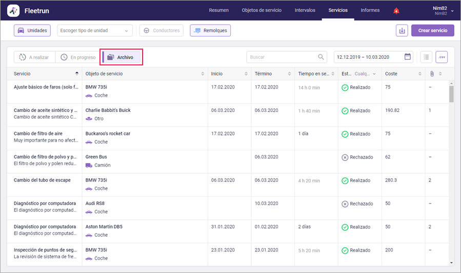 — filtrar según el tipo de objetos de servicio. Los servicios realizados para unidades se filtran también según el tipo de vehículo.