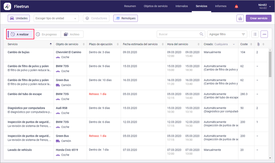 El servicio son los trabajos relacionados con el mantenimiento técnico del vehículo o control de la vigencia de documentos y permisos del conductor. Los servicios pueden crearse manual- o automáticamente (a base de intervalos de mantenimiento).