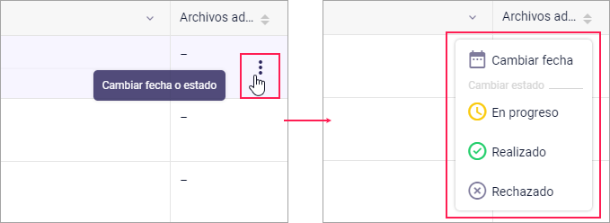 . Al apretarlo, se abre el menú de acceso rápido a la modificación. Se puede cambiar la fecha y el estado de los servicios a realizar y el estado de los servicios en progreso.