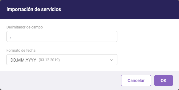 Escoja el formato de fecha. Para un archivo en formato CSV, indique también el delimitador de campo que se utiliza en este archivo.