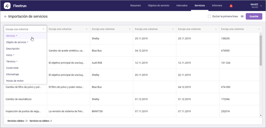 Indique los nombres de columnas en la tabla con los resultados de importación. Para hacerlo, en la lista desplegable encima de la columna escoja el nombre de la misma. Si en los servicios de unidades hay campos personalizados, en la lista desplegable también se muestran sus nombres. Las columnas obligatorias se marcan en la lista con un asterisco. Para anular la selección, haga clic en el icono
