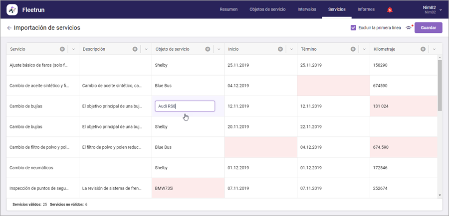 Modifique datos en la tabla si es necesario. Las celdas con datos inválidos se resaltan en rojo. No se puede importar los servicios con tales celdas. Para corregir los datos, haga clic en la celda e introduzca un texto nuevo. Para guardar el texto, haga clic con el botón izquierdo del ratón fuera de la celda.