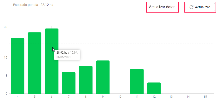 En la gráfica diaria con el color verde se muestra el área realmente cultivada en cada día de la campaña. En caso de cultivaciones combinadas, en esta gráfica, a diferencia de la circular, en el área cultivada se incluyen áreas de cultivaciones separadas que forman parte de la cultivación combinada.
