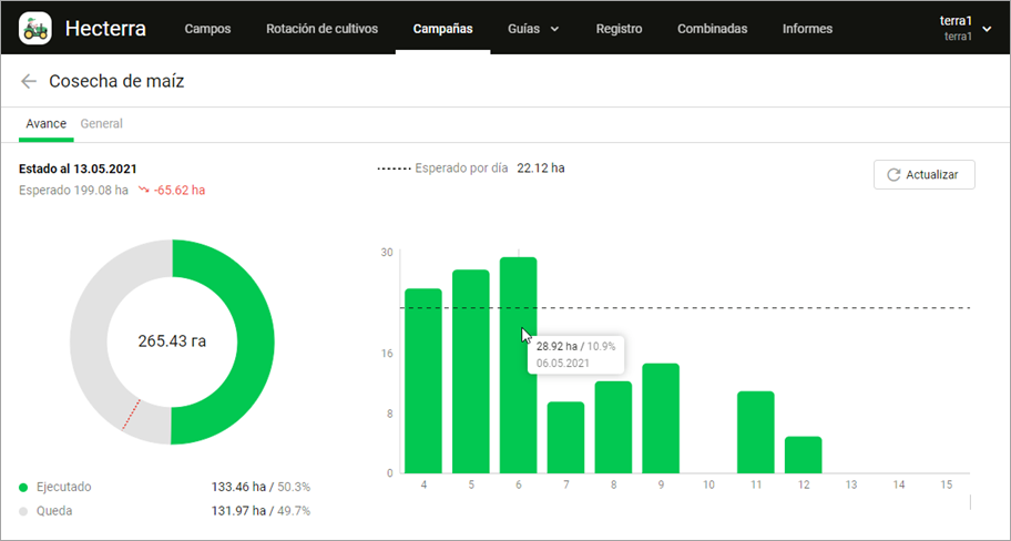 El avance de la campaña se muestra en dos gráficas: general (circular) y diaria (de barras). Para que los datos en las gráficas se actualicen, tiene que registrar regularmente las cultivaciones para los campos de la campaña. Para ver las gráficas, haga clic en la línea de la campaña en la lista y abra la pestaña Avance.