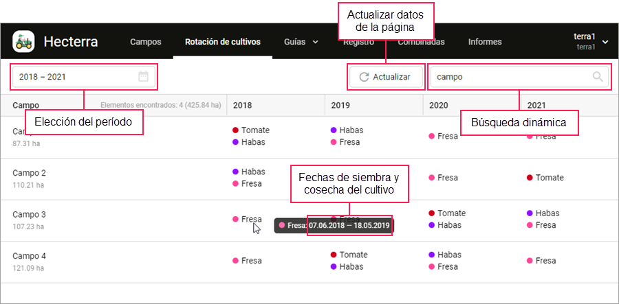 Al apuntar con el cursor a la celda con un cultivo o cultivos, al lado de su nombre se muestran fechas de siembra y cosecha (si la hay).