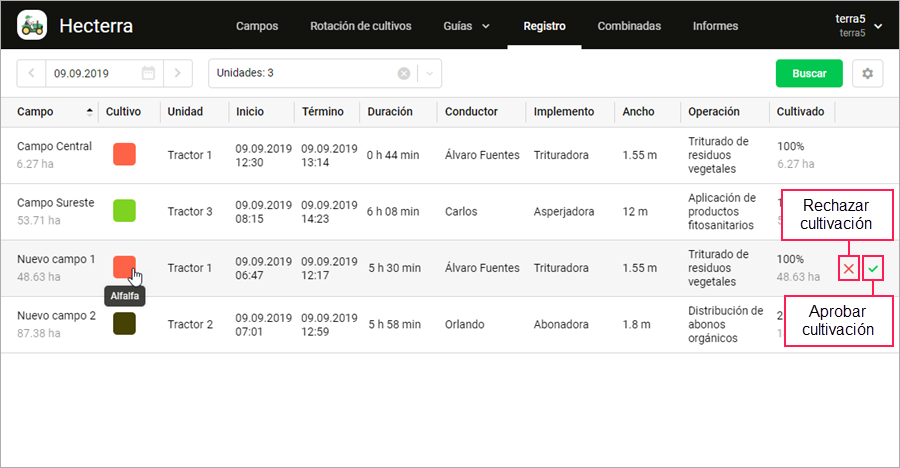 Desde la tabla, también puede aprobar o rechazar la cultivación. Para hacerlo, apunte con el cursor a la línea de la cultivación y escoja la acción necesaria.