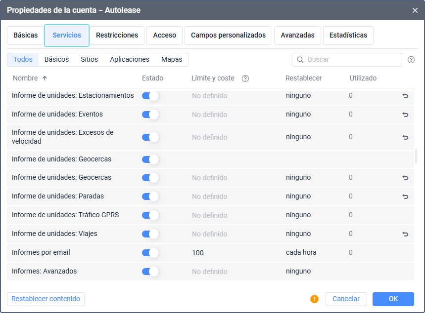 El grupo incluye funcionalidades generales de LeaseControl, como Unidades, Comandos, Geocercas y otros. Aquí puede activar o desactivar el servicio, configurar el ajuste Límite y coste y seleccionar el período de reinicio.