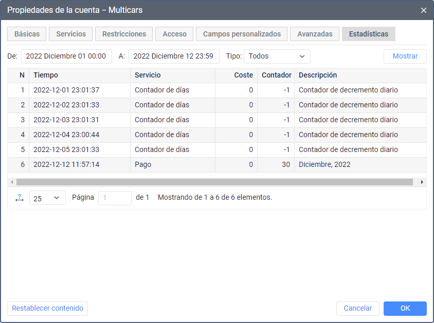 | Contador | Es la cantidad usada del servicio o cantidad de días agregados. Si el valor es negativo, significa el número de días restados. |
