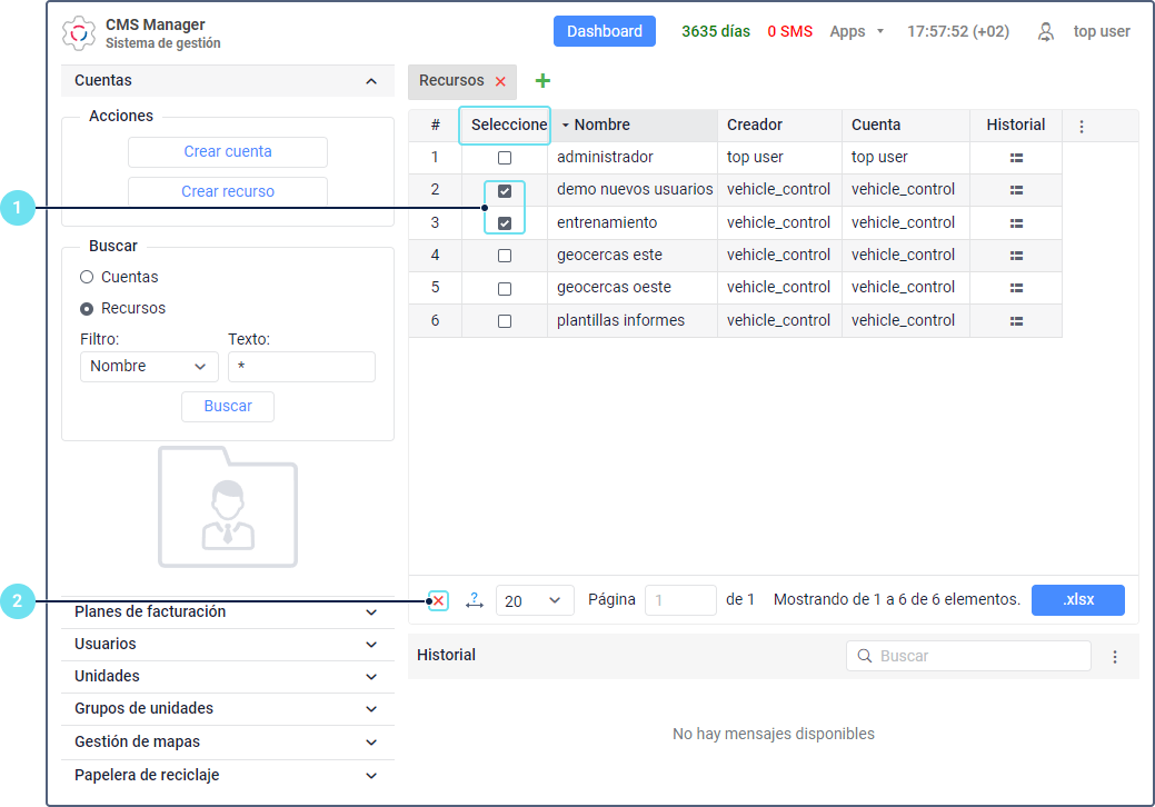 - todos los macroobjetos que pertenecen a la cuenta (cuentas subordinadas, recursos, usuarios, unidades y grupos de unidades).