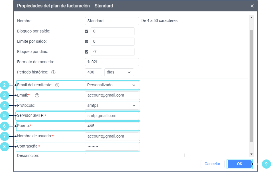 En la pestaña Básicas se puede realizar los ajustes básicos del plan de facturación relacionados con el bloqueo de cuentas, almacenamiento de datos, etc. Puede reajustar también algunas de estas propiedades individualmente para cada cuenta. Aquí también se configuran los ajustes de correo electrónico para el envío de mensajes del sistema (notificaciones, informes, etc.).