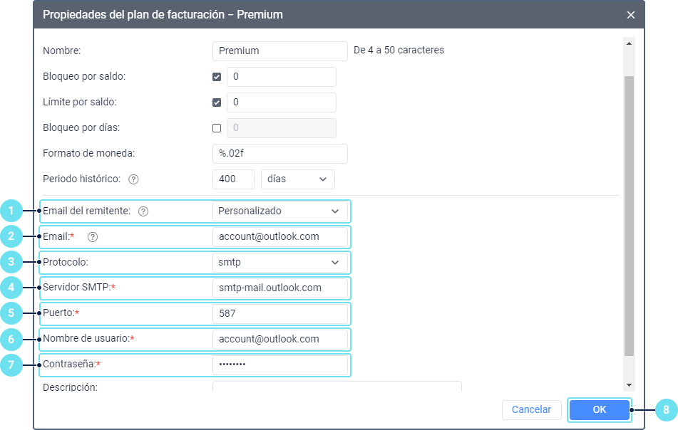 | Puerto | Puerto del servidor. Normalmente, para SMTP se utilizan los puertos 25 y 587; para SMTPS, 465. |