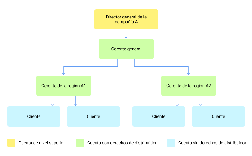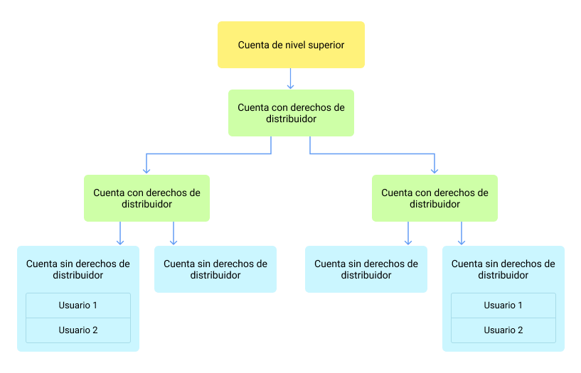 Se recomienda tener al menos tres niveles en la jerarquía: cuenta de nivel superior, cuenta con derechos de distribuidor y cuenta sin derechos de distribuidor. Dependiendo de las particularidades de su negocio, puede ser necesaria una estructura del servicio más profunda y ramificada.