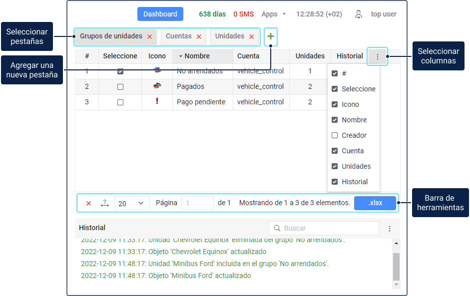 | Unidades | Cantidad de unidades en el grupo (solo para la tabla Grupos de unidades). |