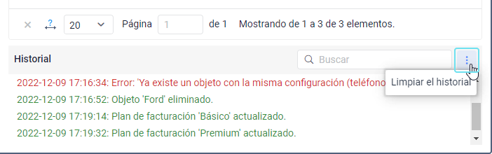 Para los registros sobre creación de un objeto, modificación de sus propiedades, eliminación exitosa, etc. se utiliza el color verde. En rojo se muestran los mensajes de error.