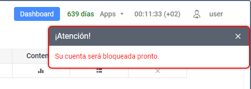 Debajo del nombre de usuario se pueden mostrar mensajes de advertencia sobre el bloqueo de la cuenta. Estos mensajes no se muestran para los usuarios de las cuentas de nivel superior.