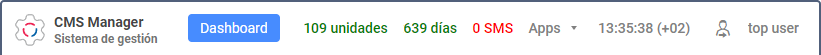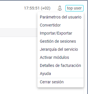 - nombre de usuario (entre paréntesis puede mostrarse un nombre de otro usuario más en caso de haber entrado el usuario principal bajo el nombre de otro). Al hacer clic en el nombre de usuario se abre el menú de usuario.
