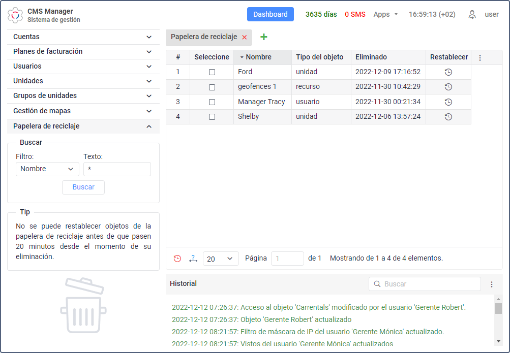 No se puede restablecer un objeto antes de que pasen 20 minutos desde el momento de su eliminación. Si desde el momento de eliminar un objeto no han pasado 20 minutos, se mostrará en la tabla, pero el botón Restablecer para tal objeto será inactivo.