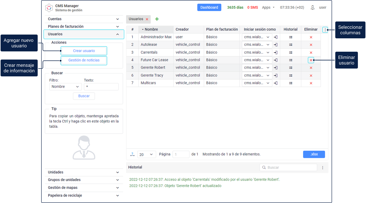 Puede gestionar usuarios en el sistema de rastreo (pestaña Usuarios) y en el sistema de gestión (sección Usuarios).