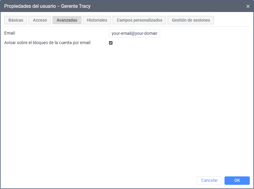 En la pestaña Avanzadas puede indicar el correo electrónico al que el usuario debe recibir los mensajes del administrador del servicio.