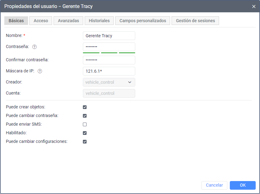 Creador Es el usuario en nombre del cual ha sido creado este usuario. El creador se toma en cuenta al distribuir derechos de acceso a las unidades. El usuario tiene la misma cuenta y plan de facturación que su creador. El creador se escoge solo al crear el usuario. No se puede cambiar esta propiedad más tarde.
