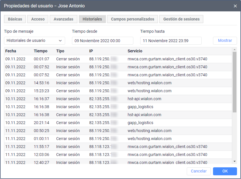 Esta pestaña contiene una tabla en la que puede ver cuántas veces el usuario ha iniciado o ha finalizado sesión en el sistema. Para obtener datos de un período determinado, escójalo en el calendario y apriete Mostrar.
