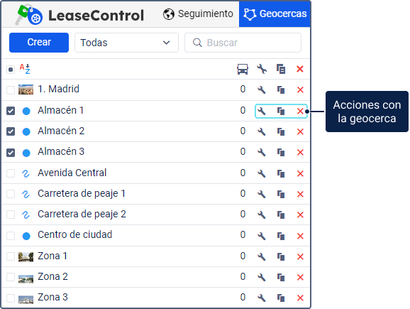 / | Eliminar geocerca. Para eliminar varias geocercas a la vez, selecciónelas y apriete el iconoencima de la lista. |