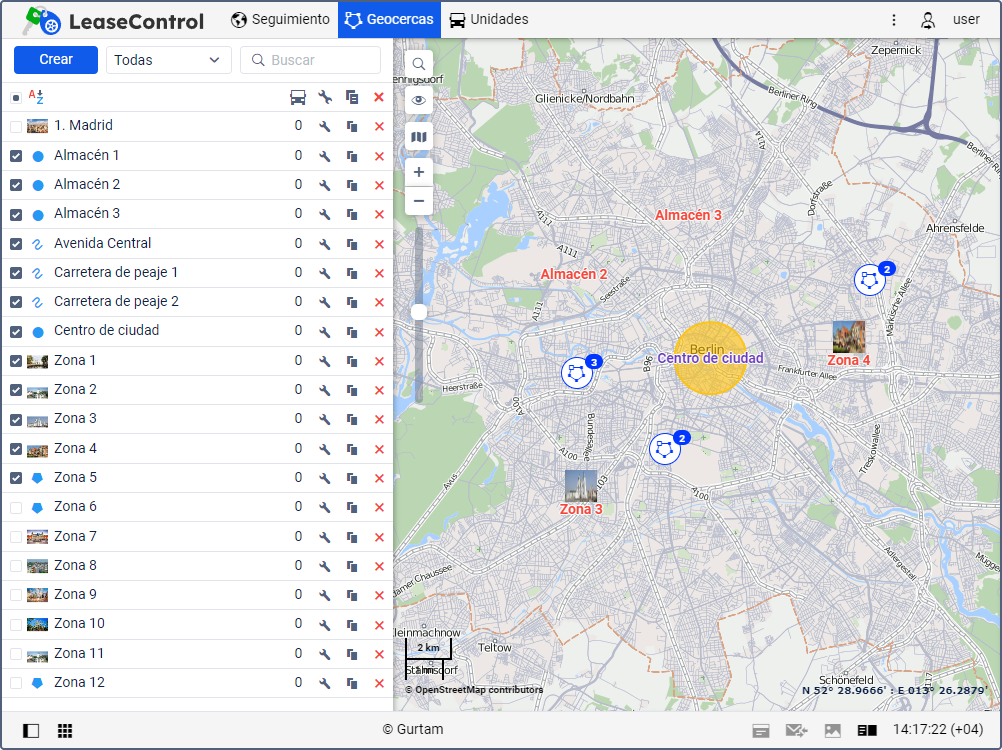 - realizar operaciones en la lista de geocercas: modificar, copiar, eliminar;