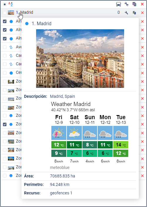 Para ver la descripción emergente de una geocerca, coloque el cursor sobre su nombre en la lista o su icono en el mapa. Asimismo, puede colocar el cursor en la geocerca misma en el mapa manteniendo apretada la tecla Ctrl.